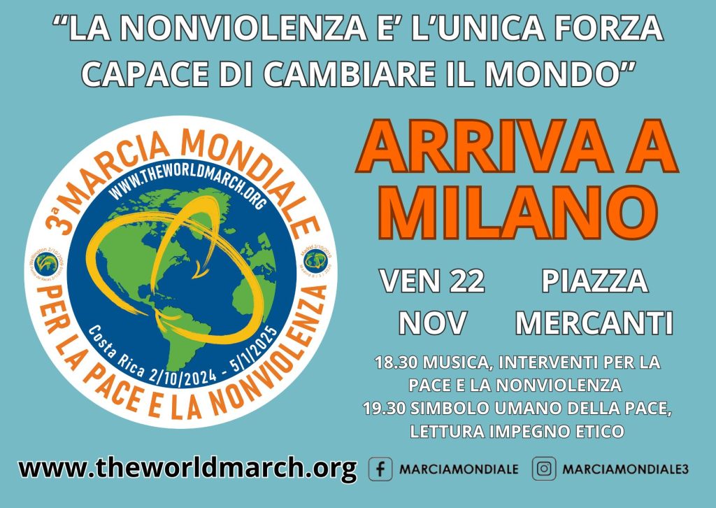 La 3ª Marcia Mondiale (3MM) per la Pace e la Nonviolenza arriva a Milano Sabato 22 novembre arrivano a Milano due marciatrici, membri del Equipe Itinerante della 3MM: la nostra Tanja Borovac e, dalla Grecia, Marilena Livanou. Ci troviamo in piazza Mercanti alle 18.00 per accoglierle. Le marciatrici condivideranno con...